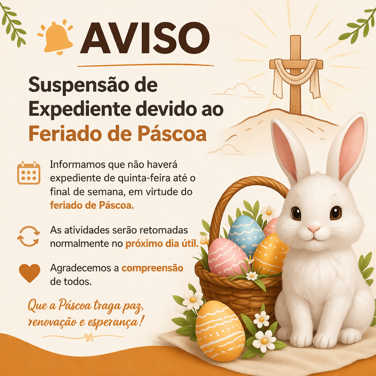 Informamos que não haverá expediente de quinta-feira, 2 de abril,  até o final de semana, em virtude do feriado de Páscoa.